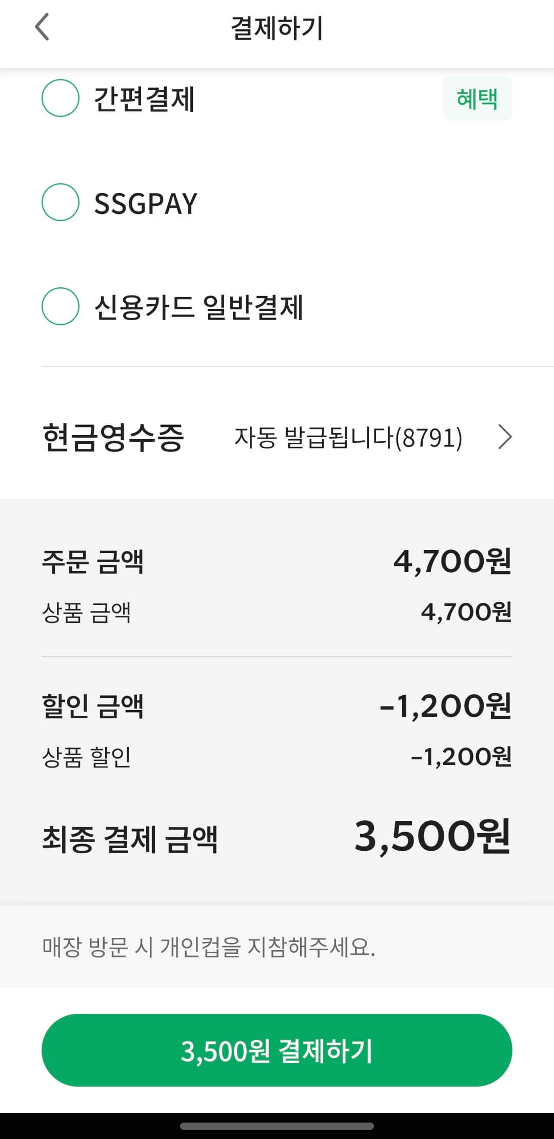 • 탄소중립제도 할인: –400원 (개인컵+전자영수증)